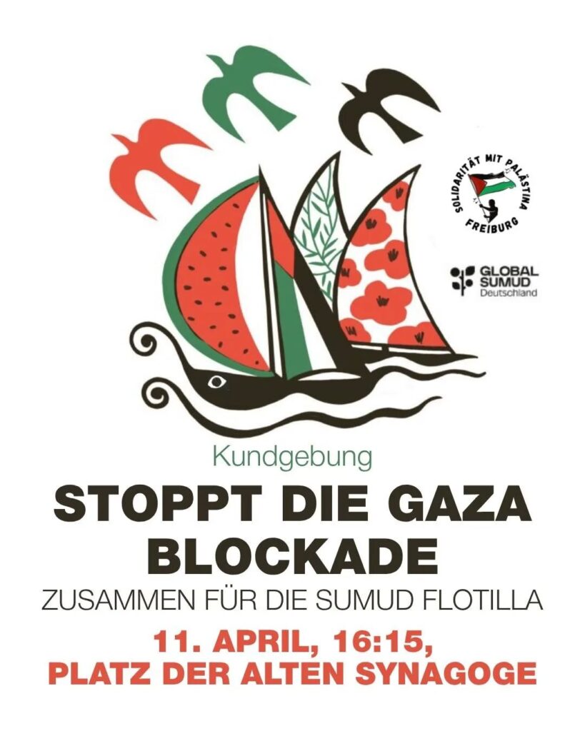 Kategorie: General Kundgebung - Stoppt die Gaza Blockade - Zusammen für die Sumud Flotilla 16:15 11. April 2026 FreiburgVeranstaltungsort anschauen Kompletten Kalender ansehen