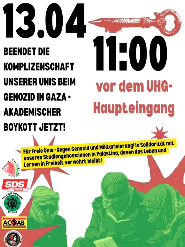 Kategorie: General Beendet die Komplizenschaft unserer Unis beim Genozid in Gaza - Akademischer Boykott jetzt! 11:00 13. April 2026 BielefeldVeranstaltungsort anschauen Kompletten Kalender ansehen