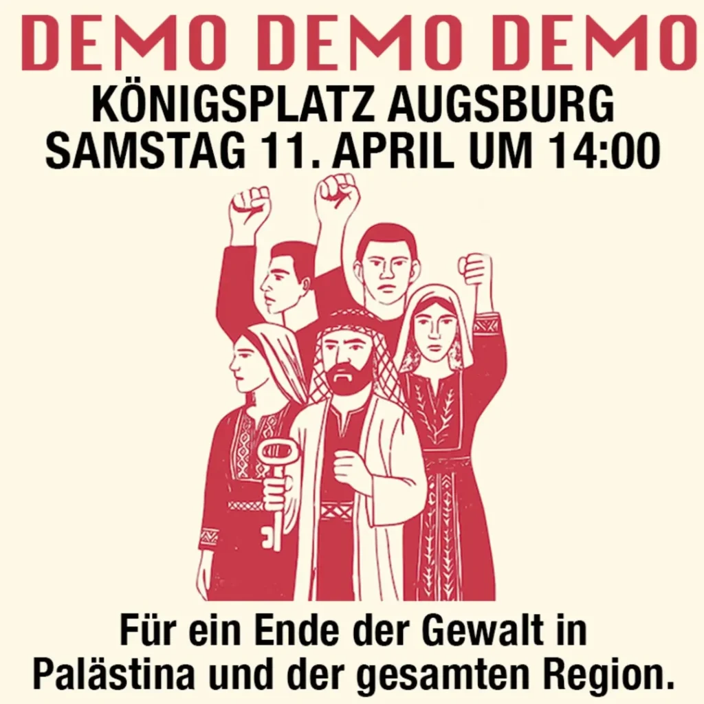 Veranstaltungskalender Kategorie: General Demo - Für ein Ende der Gewalt in Palästina und der gesamten Region 14:00 11. April 2026 AugsburgVeranstaltungsort anschauen Kompletten Kalender ansehen