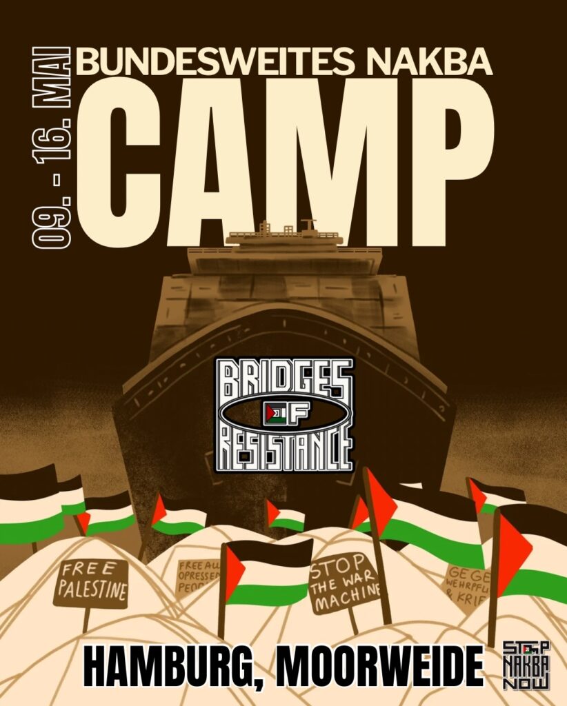 Kategorie: General Bundesweites NAKBA Camp 09. - 16.05.2026 - Bridges of Resistance n. a. 9. Mai 2026 HamburgVeranstaltungsort anschauen Kompletten Kalender ansehen