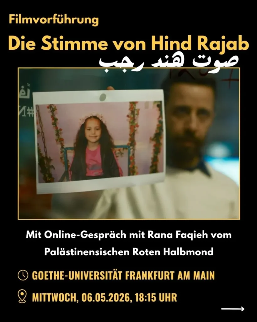 Kategorie: General Filmvorführung - Die Stimme von Hind Rajab 18:15 6. Mai 2026 Frankfurt / MVeranstaltungsort anschauen Kompletten Kalender ansehen
