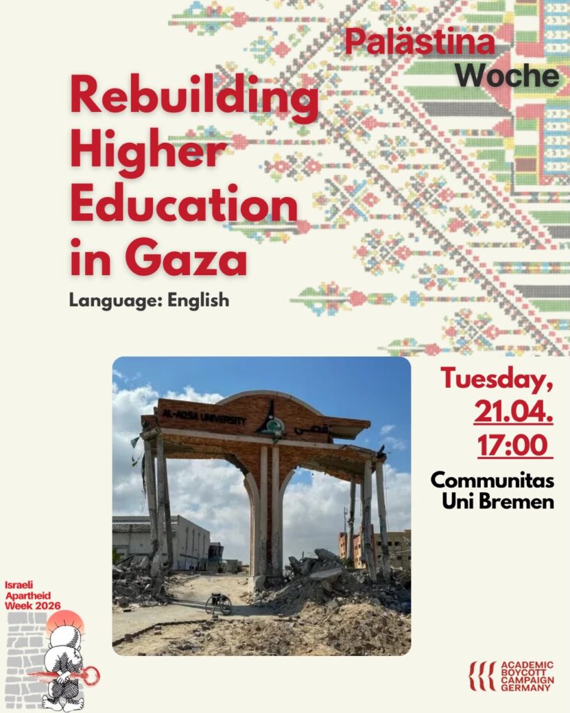 Kategorie: General Rebuilding Higher Education in Gaza - Palästina Woche - Israeli Apartheid Week 17:00 – 18:0021. April 2026 BremenVeranstaltungsort anschauen Kompletten Kalender ansehen