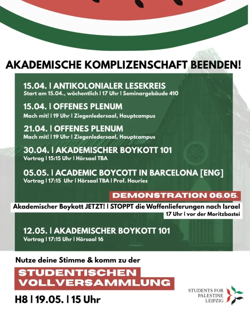 Veranstaltungskalender Kategorie: General Vortrag - Academic Boycott in Barcelona (engl.) - Akademische Komplizenschaft beenden! 17:15 5. Mai 2026 LeipzigVeranstaltungsort anschauen Kompletten Kalender ansehen