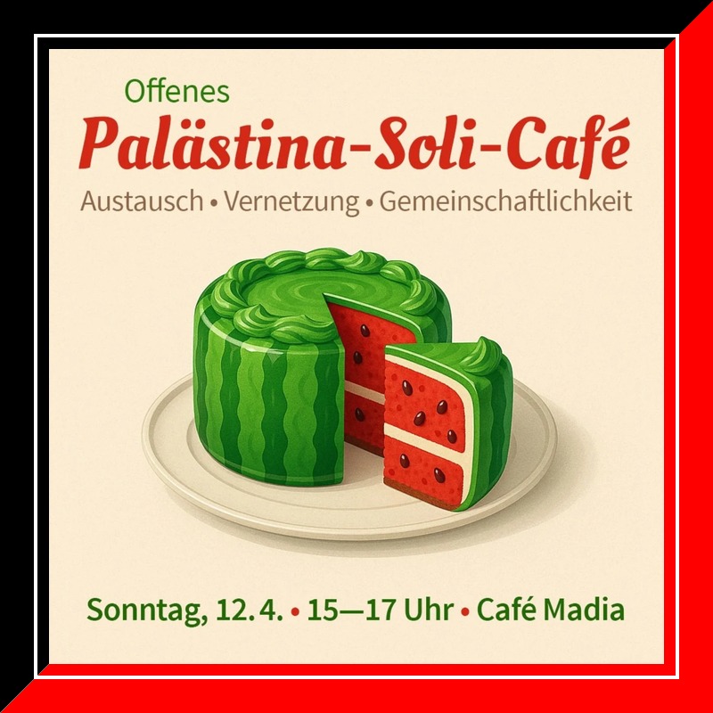 Veranstaltungskalender Kategorie: General Offenes Palästina-Soli-Café - Austausch - Vernetzung - Gemeinschaftlichkeit 15:00 – 17:0012. April 2026 PotsdamVeranstaltungsort anschauen Kompletten Kalender ansehen