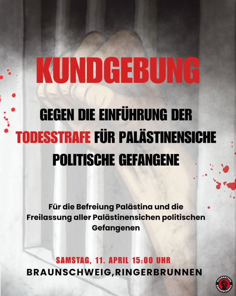 Kategorie: General Kundgebung gegen die Einführung der Todesstrafe für palästinensische Gefangene 15:00 11. April 2026 BraunschweigVeranstaltungsort anschauen Kompletten Kalender ansehen