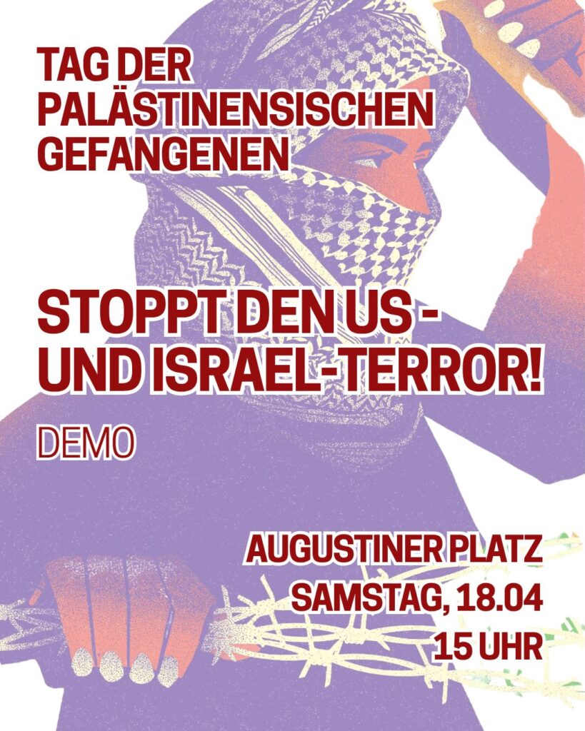 Veranstaltungskalender Kategorie: General Demo - Stoppt den US- und Israelterror - Tag der palästinensischen Gefangenen 15:00 18. April 2026 FreiburgVeranstaltungsort anschauen Kompletten Kalender ansehen