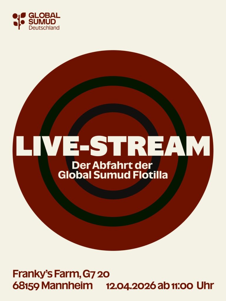 Kategorie: General Live-Stream der Abfahrt der Global Sumud Flotilla 11:00 12. April 2026 MannheimVeranstaltungsort anschauen Kompletten Kalender ansehen