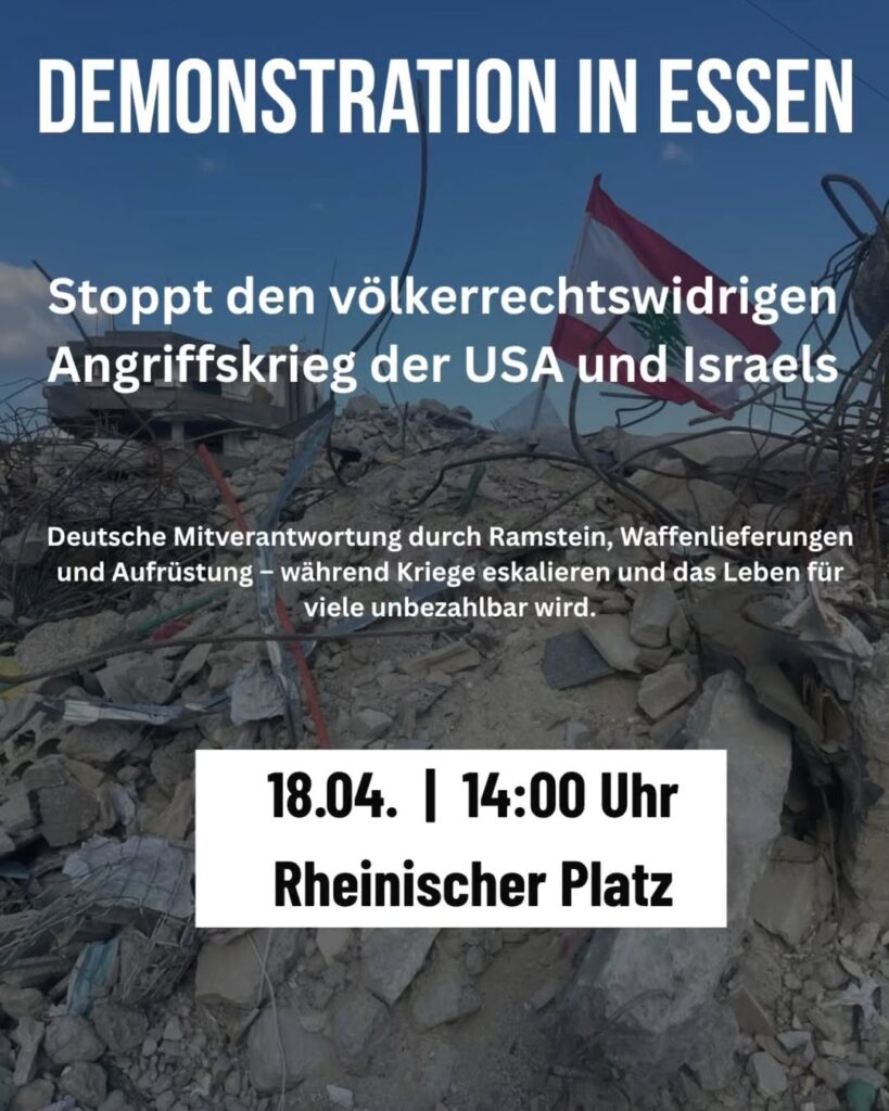 Kategorie: General Demonstration in Essen - Stoppt den völkerrechtswidrigen Angriffskrieg der USA und Israels 14:00 18. April 2026 EssenVeranstaltungsort anschauen Kompletten Kalender ansehen