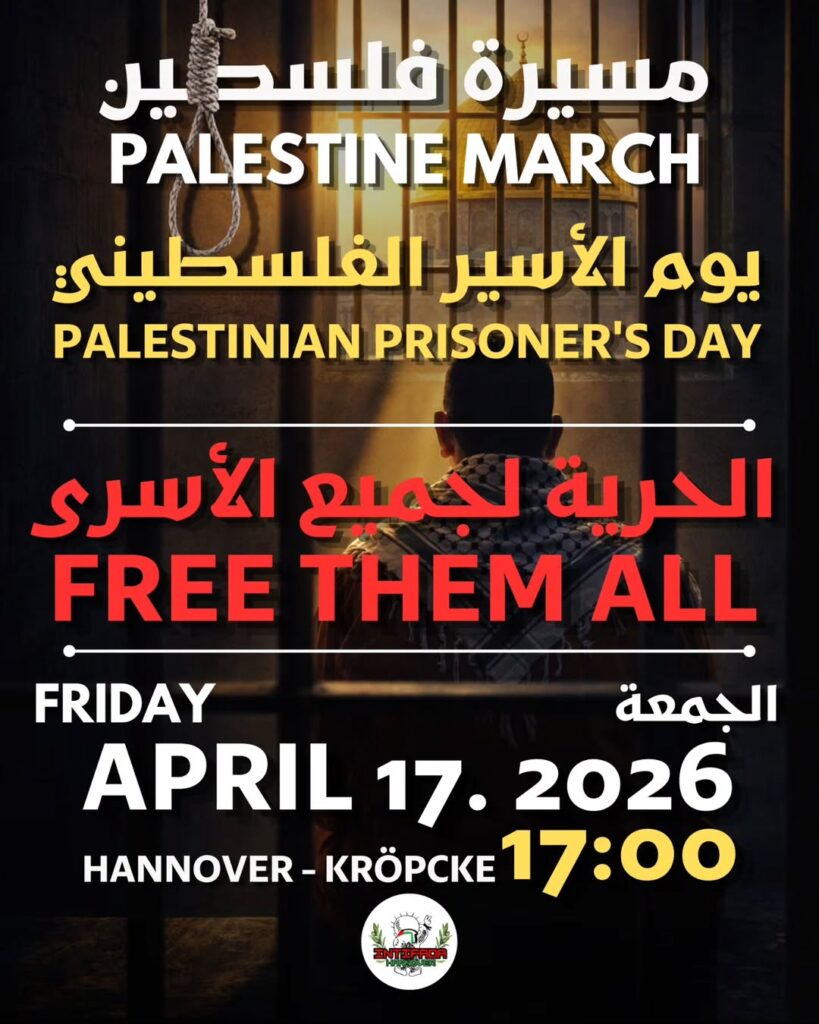 Kategorie: General Palästina March - Palestinian Prisoner´s Day - Free the all 17:00 17. April 2026 HannoverVeranstaltungsort anschauen Kompletten Kalender ansehen
