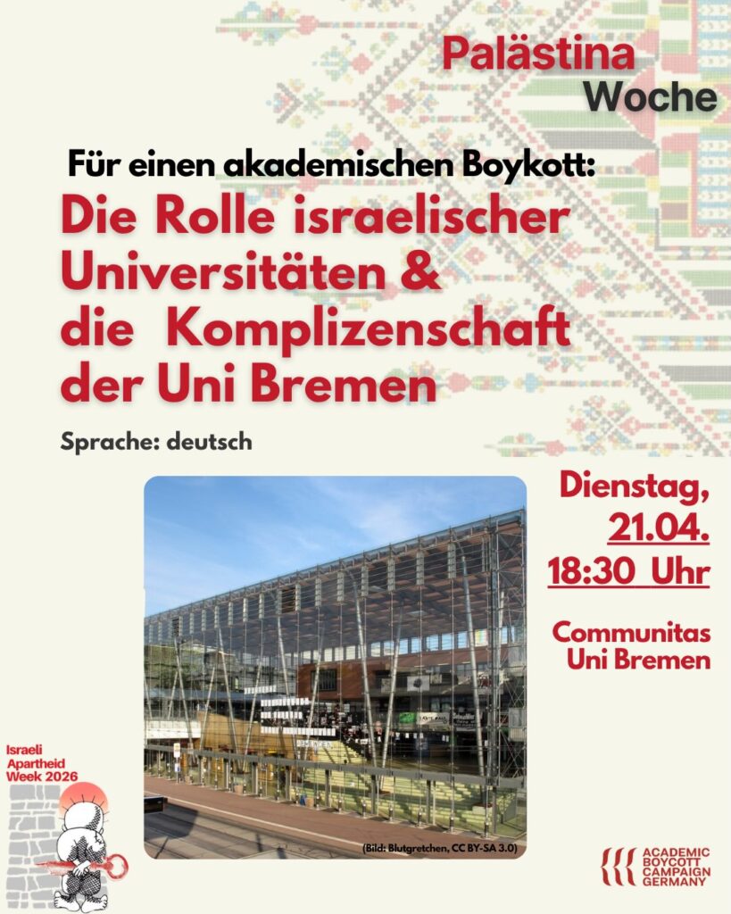 Veranstaltungskalender Kategorie: General Die Rolle israelischer Universitäten & die Komplizenschaft der Uni Bremen 18:30 21. April 2026 BremenVeranstaltungsort anschauen Kompletten Kalender ansehen
