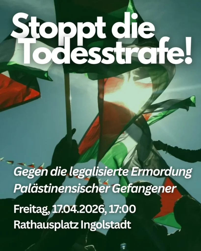 Kategorie: General Stoppt die Todesstrafe! Gegen die legalisierte Ermordung palästinensischer Gefangene 17:00 17. April 2026 IngoldstadtVeranstaltungsort anschauen Kompletten Kalender ansehen