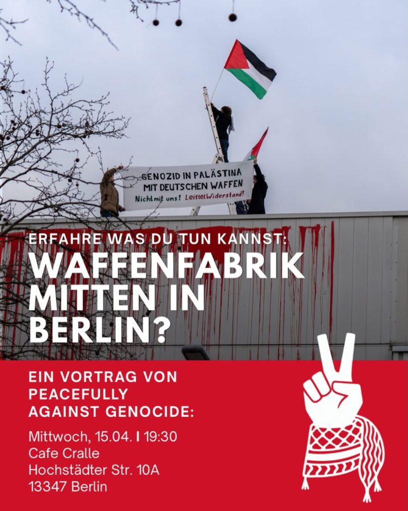 Kategorie: General Vortrag - Erfahre was du tun kannst: Waffenfabrik mitten in Berlin? 19:30 15. April 2026 BerlinVeranstaltungsort anschauen Kompletten Kalender ansehen