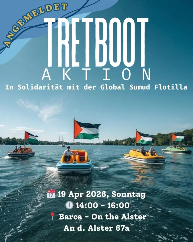 Kategorie: General Tretboot Aktion in Solidarität mit der Global Sumud Flotilla 14:00 – 16:0019. April 2026 HamburgVeranstaltungsort anschauen Kompletten Kalender ansehen