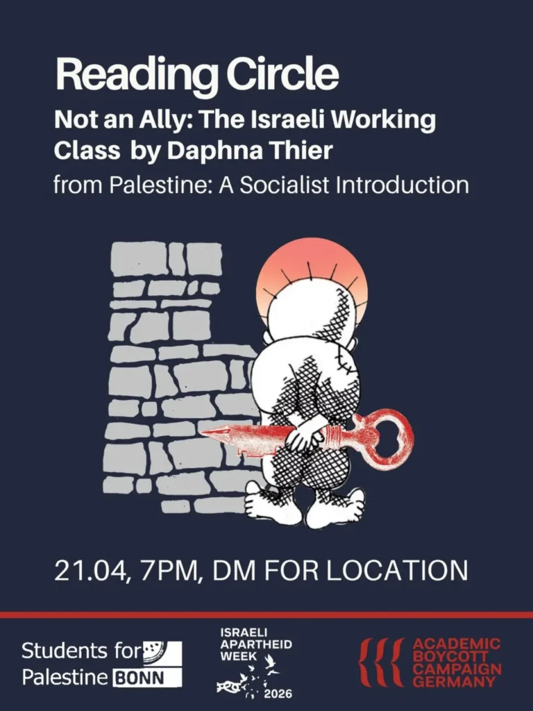 Kategorie: General Reading Circle - Not an Ally: The Israeli Working Class by Daphne Their 19:00 21. April 2026 BonnVeranstaltungsort anschauen Kompletten Kalender ansehen