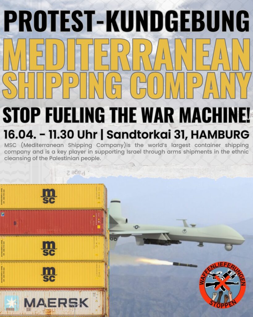 Kategorie: General Protest-Kundgebung - Mediterranean Shipping Company - Stop fueling the War Machine! 11:30 16. April 2026 HamburgVeranstaltungsort anschauen Kompletten Kalender ansehen