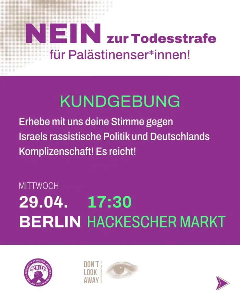 Veranstaltungskalender Kategorie: General Kundgebung - NEIN zur Todesstrafe für Palästinenser*innen! 17:30 29. April 2026 BerlinVeranstaltungsort anschauen Kompletten Kalender ansehen