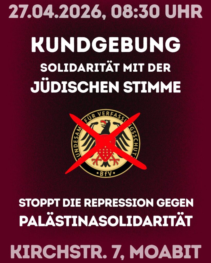 Kategorie: General Kundgebung - Solidarität mit der Jüdischen Stimme - Stoppt die Repression gegen Palästinasolidarität 8:30 27. April 2026 BerlinVeranstaltungsort anschauen Kompletten Kalender ansehen