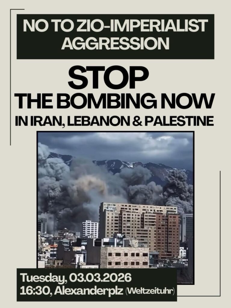 Veranstaltungskalender Kategorie: General Stop the Bombing now in Iran, Lebanon & Palestine 16:30 3. März 2026 BerlinVeranstaltungsort anschauen Kompletten Kalender ansehen