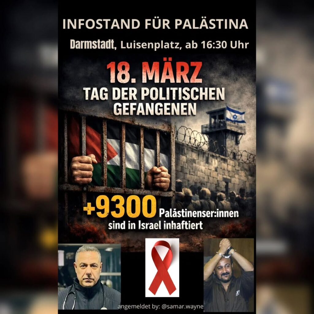 Kategorie: General Infstand für Palästina - 18. März - Tag der politischen Gefangenen 16:30 18. März 2026 DarmstadtVeranstaltungsort anschauen Kompletten Kalender ansehen