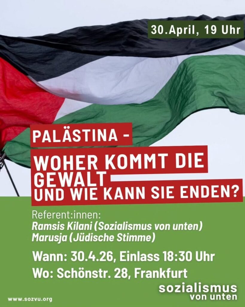 Kategorie: General Veranstaltung: Palästina - Woher kommt die Gewalt und wie kann sie enden? 18:30 30. April 2026 Frankfurt / MVeranstaltungsort anschauen Kompletten Kalender ansehen