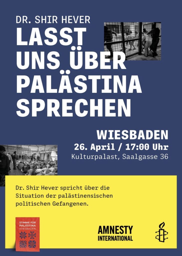 Veranstaltungskalender Kategorie: General Dr Shir Hever: Über die Situation der palästinensischen Gefangenen 17:00 26. April 2026 WiesbadenVeranstaltungsort anschauen Kompletten Kalender ansehen