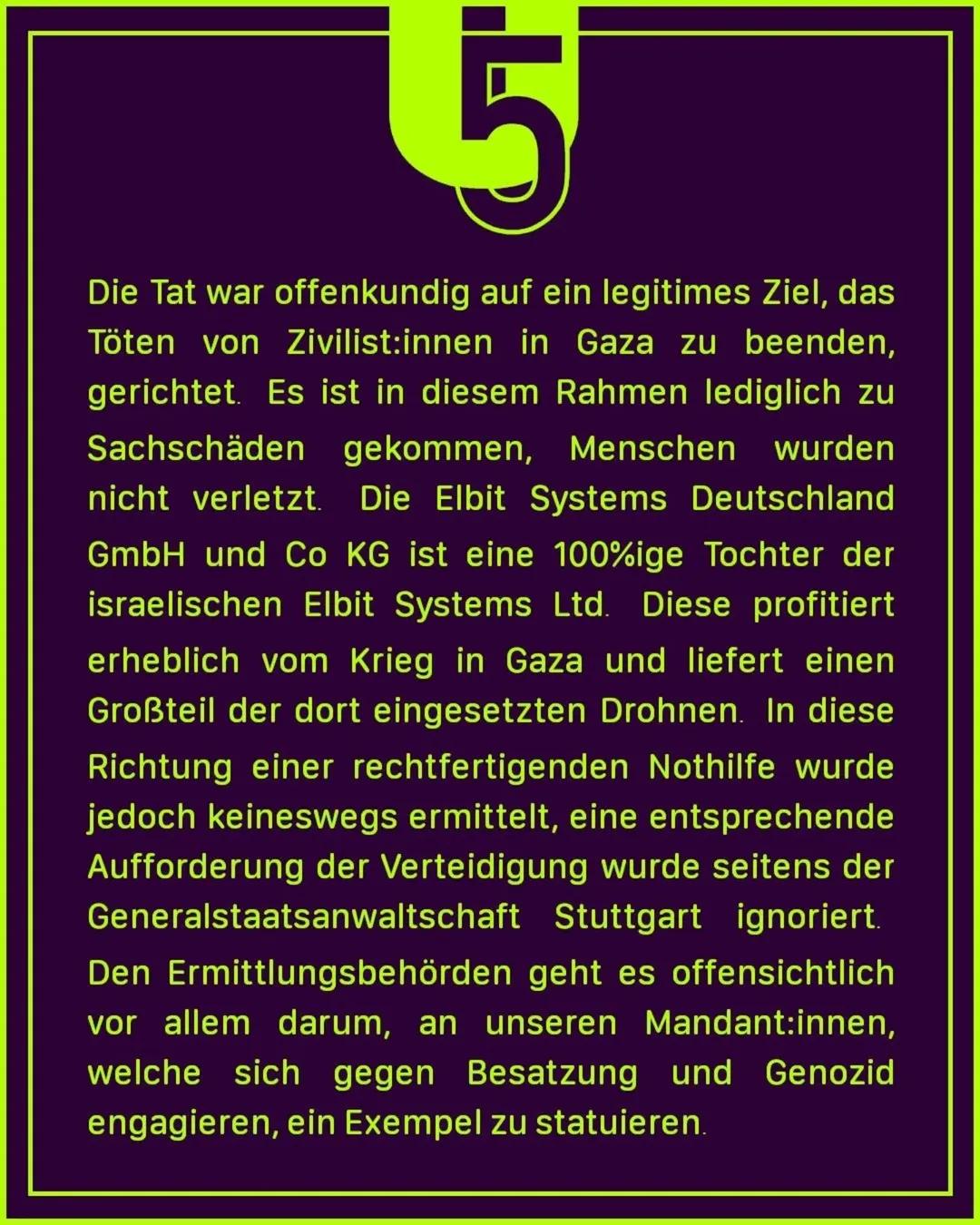 Die Tat war offenkundig auf ein legitimes Ziel, das Töten von Zivilist:innen in Gaza zu beenden, gerichtet. Es ist in diesem Rahmen lediglich zu Sachschäden gekommen, Menschen wurden nicht verletzt. Die Elbit Systems Deutschland GmbH und Co KG ist eine 100%ige Tochter der israelischen Elbit Systems Ltd. Diese profitiert erheblich vom Krieg in Gaza und liefert einen Großteil der dort eingesetzten Drohnen. In diese Richtung einer rechtfertigenden Nothilfe wurde jedoch keineswegs ermittelt, eine entsprechende Aufforderung der Verteidigung wurde seitens der Generalstaatsanwaltschaft Stuttgart ignoriert. Den Ermittlungsbehörden geht es offensichtlich vor allem darum, an unseren Mandant:innen, welche sich gegen Besatzung und Genozid engagieren, ein Exempel zu statuieren.