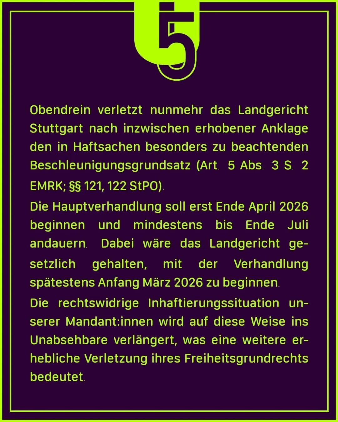 Die Hauptverhandlung soll erst Ende April 2026 beginnen und mindestens bis Ende Juli andauern. Dabei wäre das Landgericht gesetzlich gehalten, mit der Verhandlung spätestens Anfang März 2026 zu beginnen. Die rechtswidrige Inhaftierungssituation unserer Mandant:innen wird auf diese Weise ins Unabsehbare verlängert, was eine weitere erhebliche Verletzung ihres Freiheitsgrundrechts bedeutet.