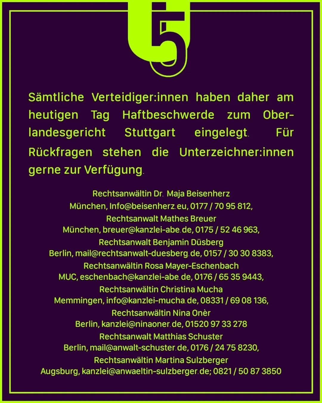 wir, die Verteidiger:innen der „Ulm 5“, haben heute Haftbeschwerde eingelegt.